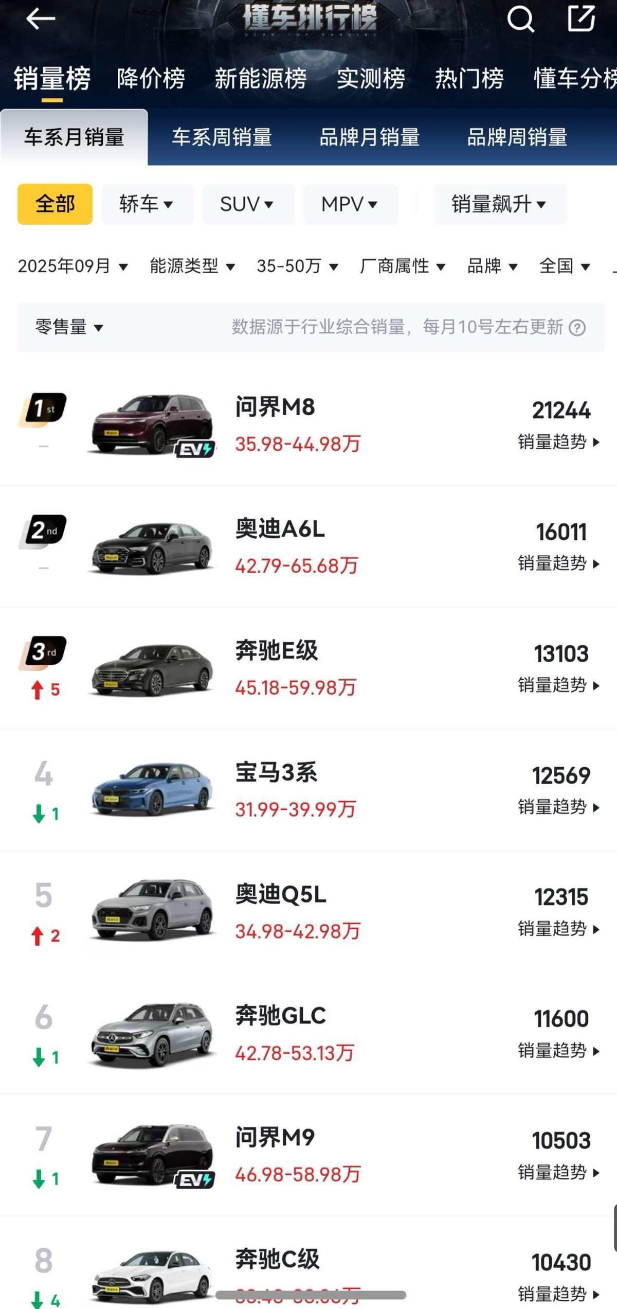 在另一边,国内三十万豪车市场正在被造车新势力围剿。上个月,在35~40万元的汽车市场中,问界M8以2.1万辆的销量排名第一,把第二名奥迪A6L远远甩在身后。