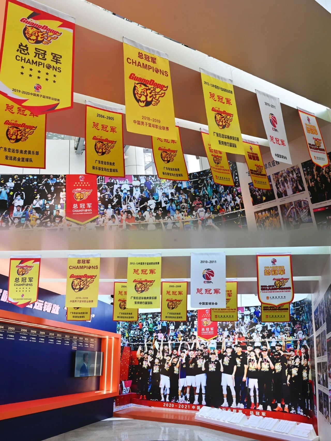 和广东宏远男篮11面冠军旗帜(复刻版)合影